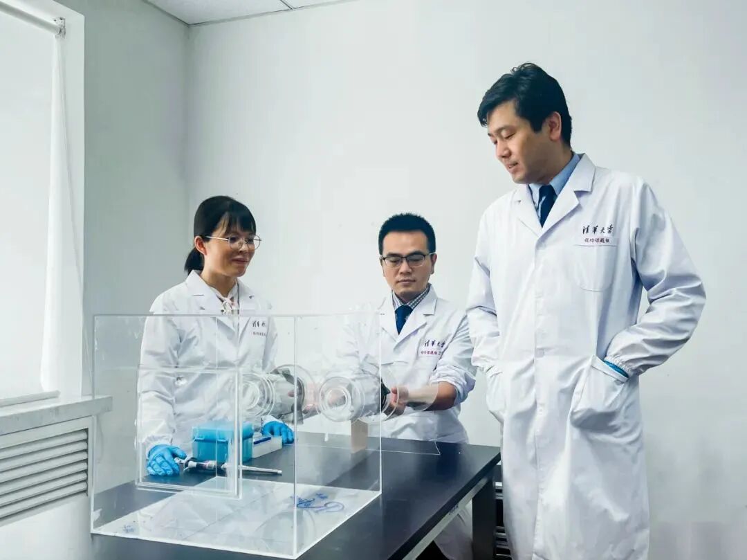 研究团队正在通过嗅觉测定装置评估蚊子的行为。从左至右依次为论文共同第一作者张虹博士、朱毅斌助理研究员以及通讯作者程功教授。(图片来源:Xuan Guo)