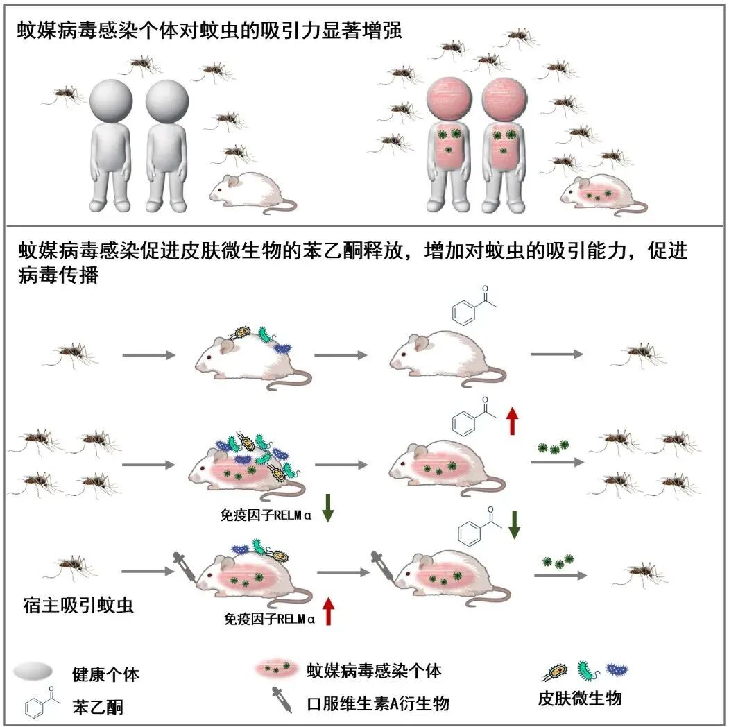 通过补充维生素A类药物,能够重塑感染个体皮肤微生物的苯乙酮释放,降低蚊媒病毒传播循环效率。(图片来源:研究团队供图)