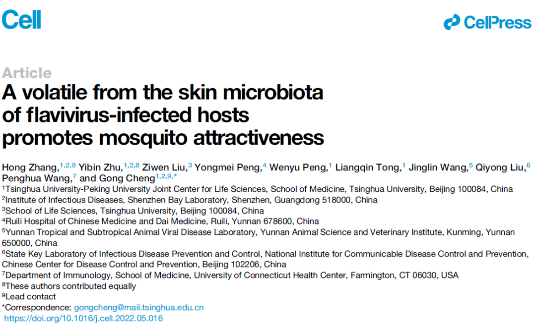 参考资料:[1] Hong Zhang et al., A volatile from the skin microbiota of flavivirus-infected hosts promotes mosquito attractiveness. Cell (2022). DOI: 10.1016/j.cell.2022.05.016