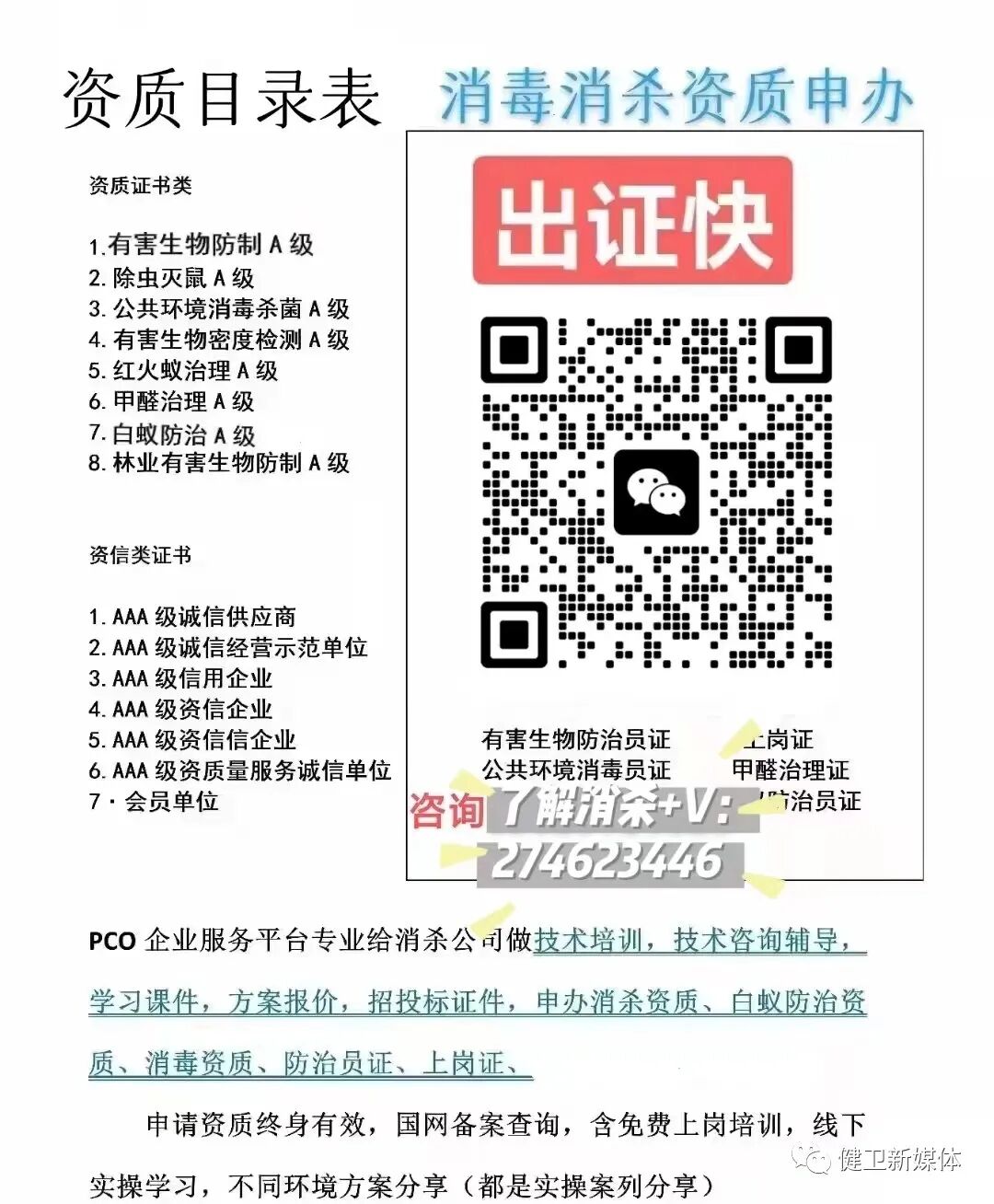 、营业执照。 看一家消杀公司需要具备有害物防治员职业资格证书,公司所有从事防治工作的人员必须要取得相应的资格证书之后,创业者才有资格在当地的市场上办理一家消杀公司。 开消杀公司之前必须要办理质量体系认证书,公司需要从事的业务经过有关部门考察之后,能够达到合格的项目部门,才能够颁发质量体系证书,这也是说明公司实力的一种方式。 开消杀公司必须要在当地提前办理好营业执照,至此之外还要在当地上办理好税务登记证和组织机构代码证。这三个证件,必须要到工商管理部门办理。 注册一个消杀公司需要哪些手续是许多投资人很想明白的知识,主要有以下三个方面的内容: 1、企业名称核准; 2、在网上交付材料; 3、申领公司执照; 4、企业刻公章; 5、银行开账户; 6、税务机构备案; 7、领取发票; 1、企业名字; 2、投资者身份证件; 3、公司经营范围; 4、企业注册地址。 (三)注册消杀公司必需花费1、政府成本零花费; 2、刻制章子开销几百元左右; 3、财税公司代办费用以及学习消杀技术的费用。添加党老师私信获取注册消杀公司详细的经营范围和取名参考吧! 主 管:健卫新媒体(深圳)集团有限公司 主 办:健卫新媒体融媒体中心 编委会 主编:刘飞 副主编:党佳燕 编委:罗纯 袁云坤 杨芬 刘飞 党佳燕 唐声烨 汪伟华 李悦兰 刘金花 投稿微信V:274623446(原创作品授权,涉及版权请联系平台)未经允许音频禁止下载违者必究平台部分图片来自网络,如有侵权告知删除 部分资料素材来源:网络 侵删 了解更多消杀行业资讯、办理消杀资质人员证、增项消杀业务请扫描二维码资讯 关注我获得 更多精彩 |